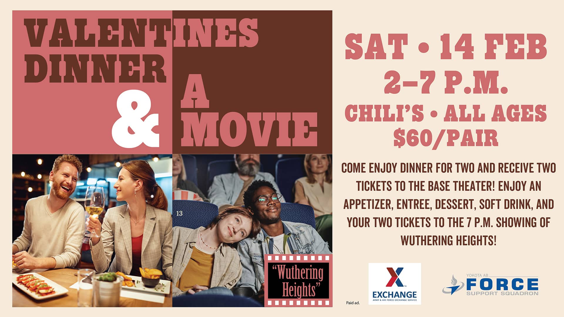 Come enjoy dinner for two and receive two tickets to the base theater! Enjoy an appetizer, entree, dessert, soft drink, and your two tickets to the 7 p.m. showing of Wuthering Heights!